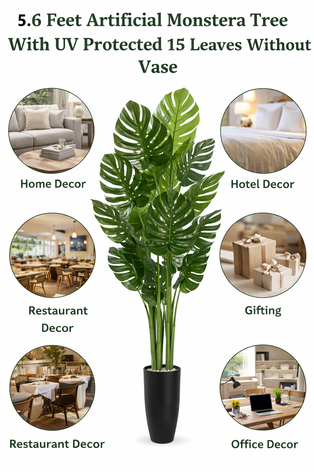 KAYKON 5.6 Feet Artificial Monstera Plant 3 Trunks 15 Leaves Real Looking Big Artificial Plant Without Vase for Home Decor Hotel Decor Luxury Collection -170cm