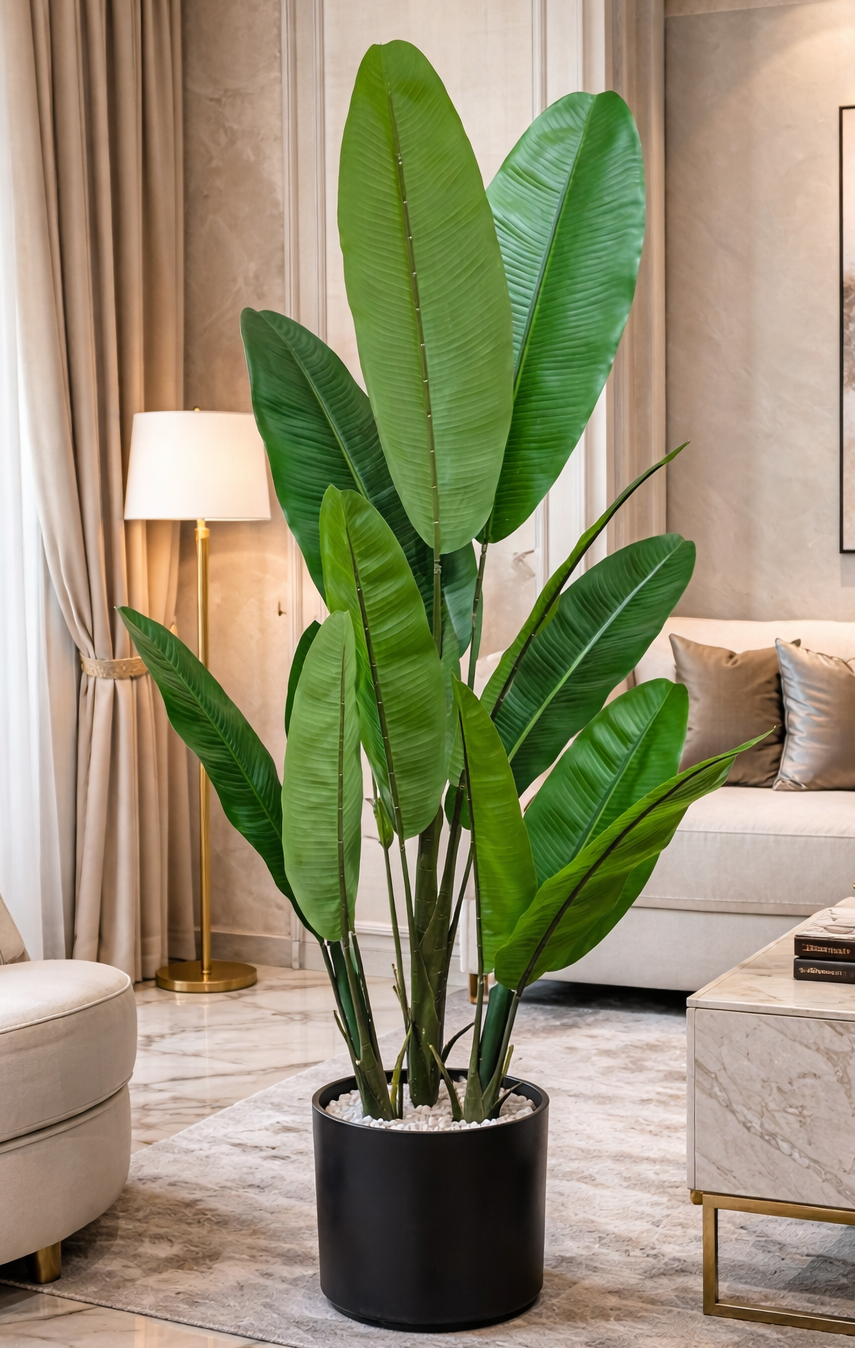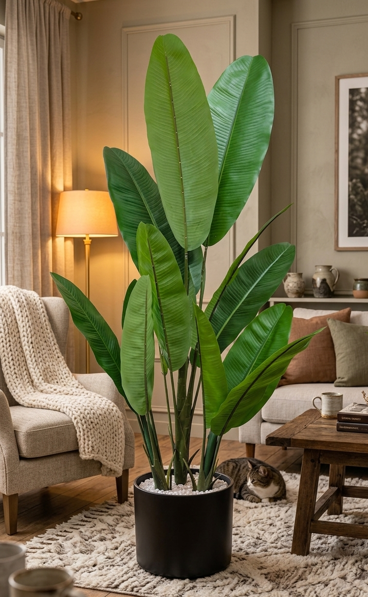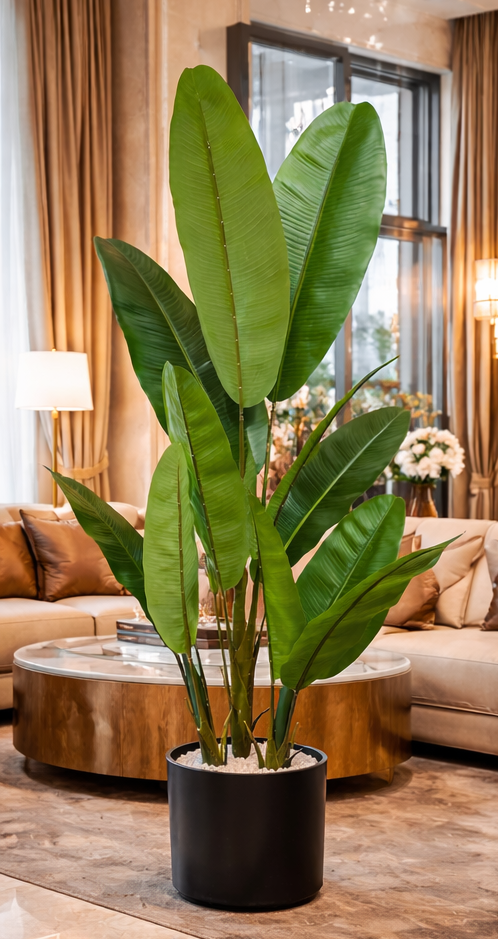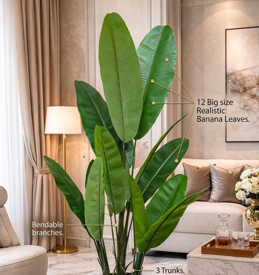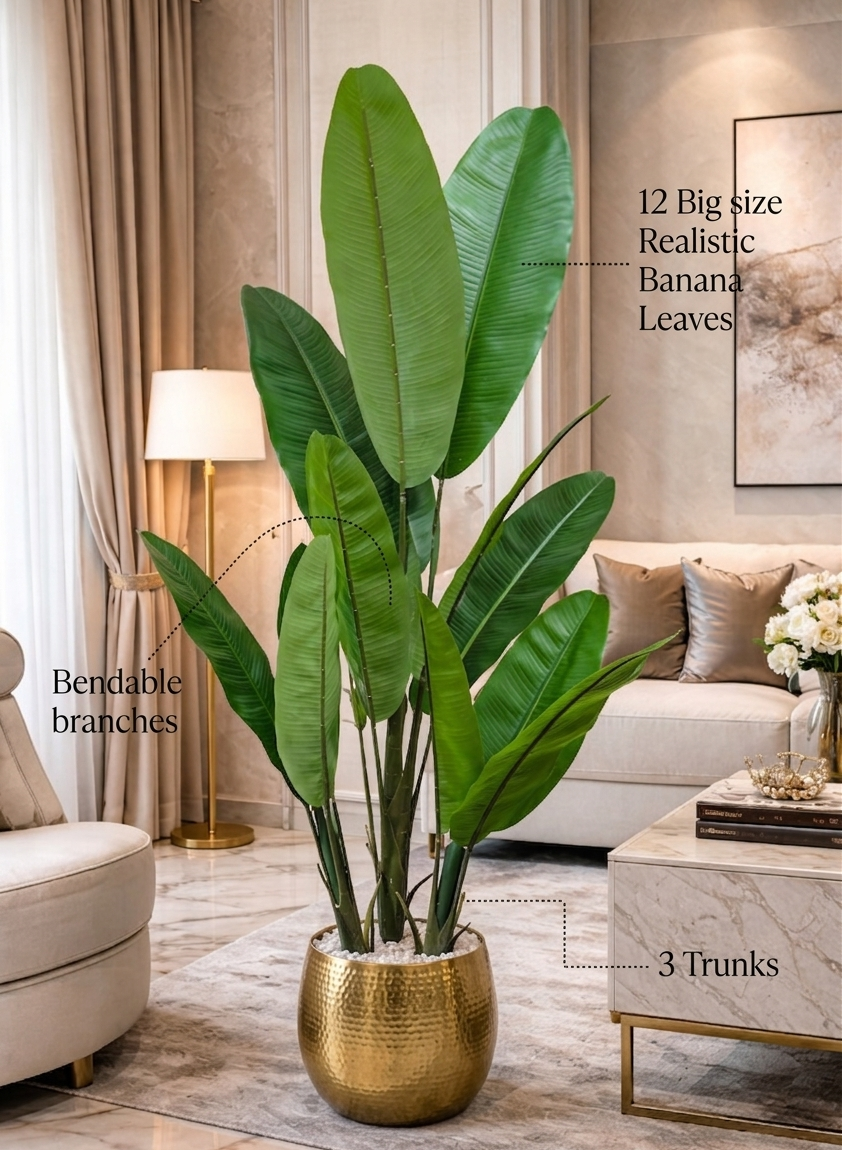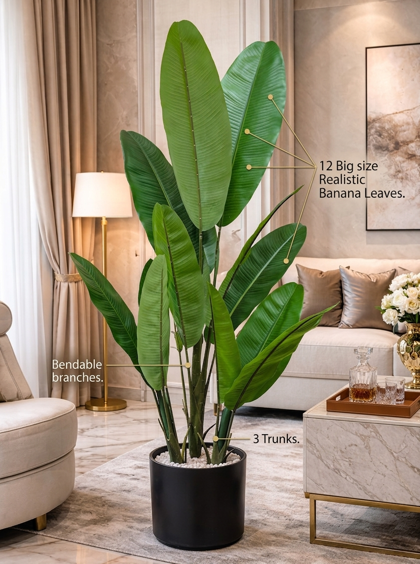 - Lifelike 180 cm Artificial Banana Plant Design: Features a stunning, realistic Artificial Banana Plant 3 trunk 12 Leaves Banana Tree standing at approximately 180 cm (6 feet) tall, providing a vibrant, cheerful focal point that instantly enhances any indoor space. Package has 3 TRUNKS. (Vase is not included)