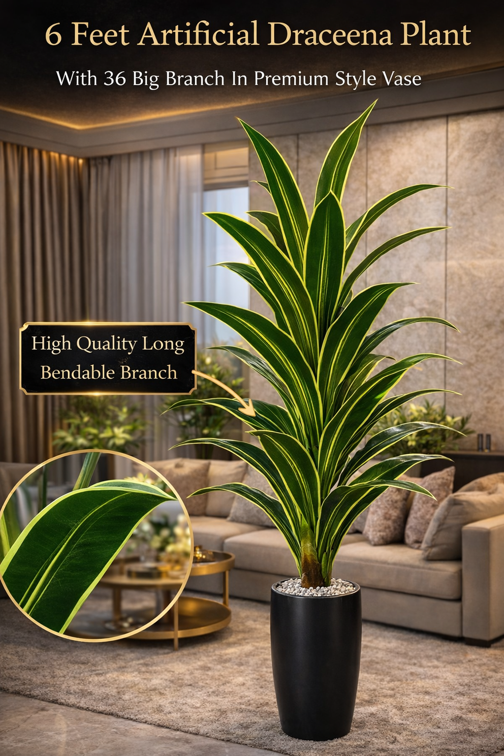 Elevate your interior aesthetics with the KAYKON 6 Feet Artificial Dracaena Plant Tree with 36 branch, a masterpiece of botanical realism designed to bring the refreshing essence of nature into your home or office without the maintenance. Standing at an impressive six feet, this statement piece features striking, variegated leaves with vibrant green and cream tones that mimic the natural growth patterns of a live Dracaena. The slender, lifelike trunks provide a sturdy and authentic silhouette, making it an ideal focal point for minimalist, contemporary, or bohemian decor styles.