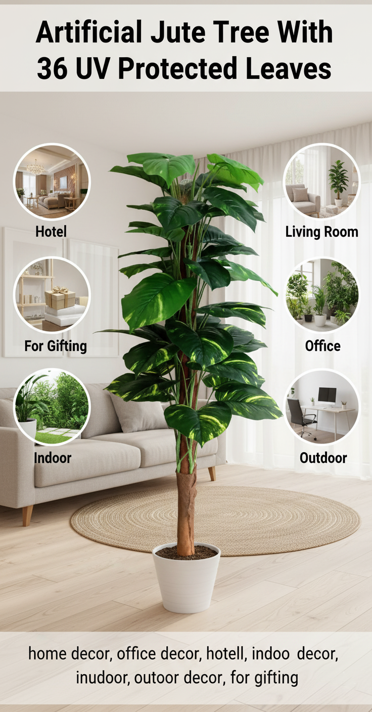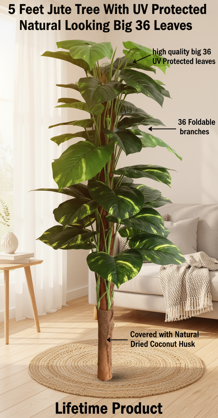 What sets this tree apart is its exceptional attention to detail. It features 36 intricately crafted branches and 36 broad, vibrant leaves that capture the natural essence of a thriving money plant. The foliage is treated with a UV-protected coating, ensuring that the deep green hues remain vivid and resistant to fading, even when placed near sunlit windows or in bright semi-outdoor spaces. The “Jute Tree” design provides a textured, organic look to the trunk, seamlessly blending rustic charm with botanical realism.